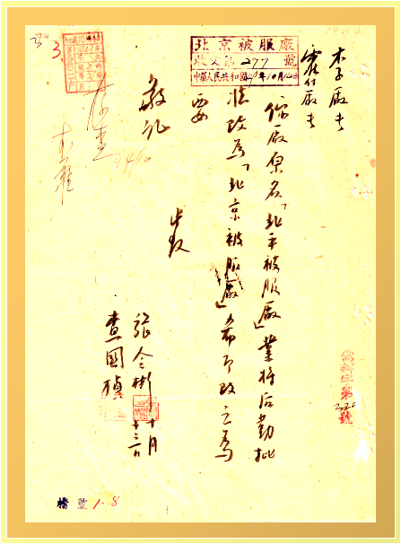 在經歷了保機護廠,迎接北平(今北京)和平解放后,我廠被中國人民解放軍華北軍區后勤部接管,同年2月21日恢復生產。1949年10月13日,我廠由總后方勤務部批準更名為“北京被服廠”。